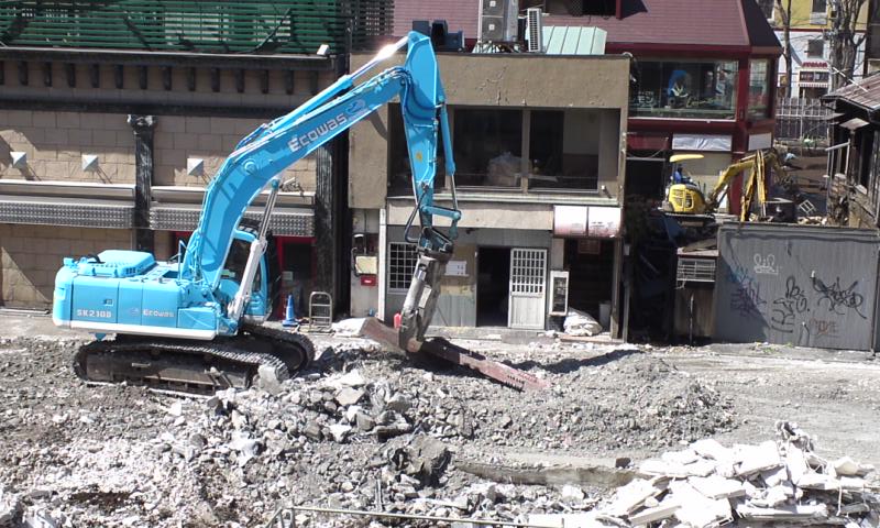 現在京王府中駅の前の一角が再開発の為に古い建物の取り壊し作業中。某嬢と待ち合わせの時間潰しに眺めました。大きな蟹の鋏のようなもので鉄骨をはさみ、レーキ代わりにしてがれきを集めていました。通りかかる人も思わず立ち止まって眺めている人が多かったです。「働くくるま」ってわくわくしますよね。