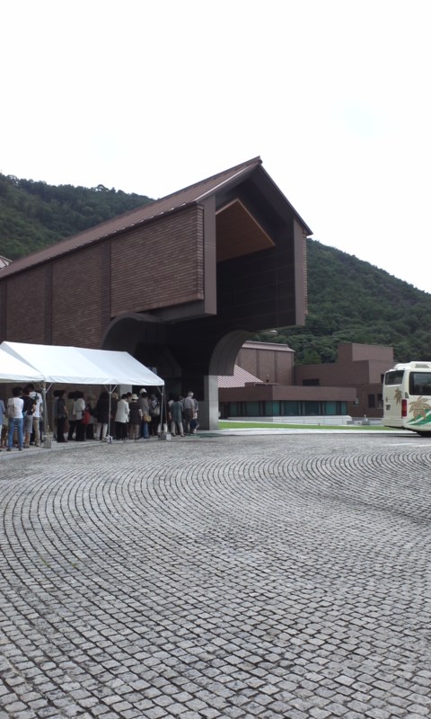 ところが、近づいていくとすでに道に車の列、入口には「ここが最後尾」の看板を持つ係の方の姿が!!入場を待つ人が長蛇の列を成しています。曇りだったし気温もさほど高くなく並んで待つのは苦ではありませんでした。それにしても、遠くからの観光ツアーバスが何台も止まっているし、駐車場は一杯。若冲人気は大したものだと感心してしまいました。そういう自分も、わざわざ新幹線で駆けつけちゃったんですけどね。