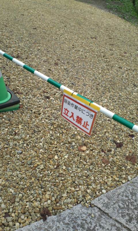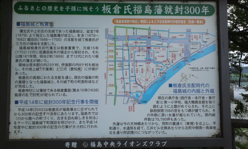 ももりんバス(市内巡回バス)にのってまずは県庁へ。土曜で人気のない県庁の敷地脇に初代福島藩主を祀った板倉神社があるのでそこを参拝。神社の境内には福島城跡の看板がありました。すぐ脇を流れる阿武隈川はこのところの大雨で増水してました。お城の庭園だったところが公園になっていましたが、現在は除染作業中で封鎖されてました。