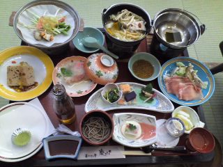旅館の大宴会場で豪華お食事をいただきました。写真の他に、お刺身と揚げたててんぷら、茶碗蒸がつきました。ものすごくお腹いっぱいになりました。しばしの休憩の後、大浴場でゆっくり温まりました。昭和36年にブドウ畑で井戸を掘っていたら突然湧きだしたという温泉なんだそうですが、透明のさらりとしたお湯でとっても良かったです。
