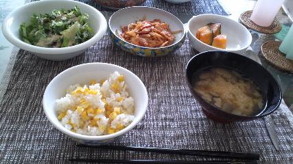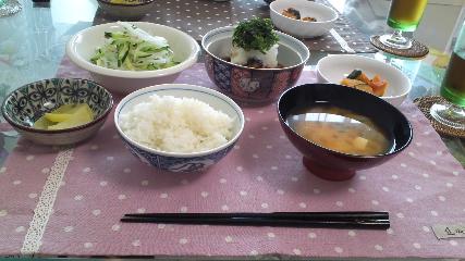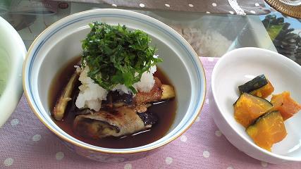 今日は新玉ねぎときゅうりと茗荷のサラダ、豚バラ肉でまいた茄子の揚げ出し、かぼちゃ、お豆腐と玉ねぎの味噌汁。