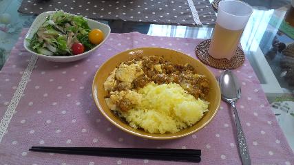今日のAさんの庭とランチ。キーマカレーにお豆腐とチーズが入っています。これが絶品なんです!!サフランライス大好き~♪デザートは、バナナヨーグルト。ブルーベリーソースがけ。