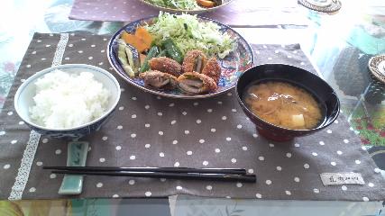今日は豚肉のチーズと青紫蘇のはさみ揚げ、付け合わせに南瓜・茄子・オクラ、ピーマン。線キャベツ・きゅうり。豆腐と玉ねぎとしめじのお味噌汁