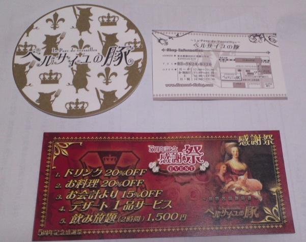 今日は出張に出かけるかぴぱら氏を駅まで送って行き、掃除・洗濯をしたあと、新宿に映画を見に行きました。その後、錦糸町で飲み会~!!場所は「ベルサイユの豚」でございました。噂に聞いていましたが、本当にいました!某氏と某嬢の名前が刻まれた豚さんのオブジェが~!!某氏の方は三角帽をかぶってるんです~。可愛いぞう~!!カクテルメニューはベルファンならつい笑って突っ込みたくなるようなものが並んでいます。お料理はいろいろな豚肉料理があってなかなか楽しかったです。ついつい飲むすぎてしまい(と言っても、ワイン2杯にサワーとビールを1杯ずつですけど)、一緒に飲んだ友人に日ごろの会社での愚痴をこぼしてしまいました。まあ、トラブルはどこの会社でもある事と言うことで、優しく慰めていただきました。
